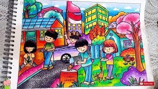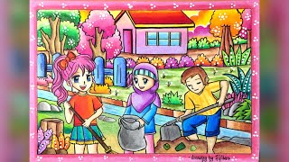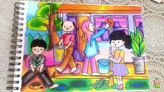 - Cara menggambar tema kerja bakti cocok untuk anak sd