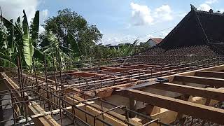 Proses cor dak beton teras rumah dari mengikat jaring besi memberi papan dan mengecornya dengan semen, batu coral dan pasir Hingga kuat.